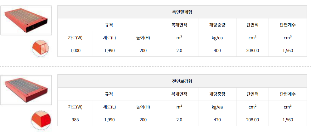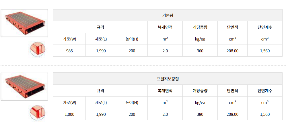 - 폭=985㎜ 길이=1,990㎜ 면적=2㎡ 무늬 H형강 구조의 복공판